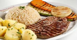 Arroz, salada na chapa, batata cozida e filé de carne na chapa